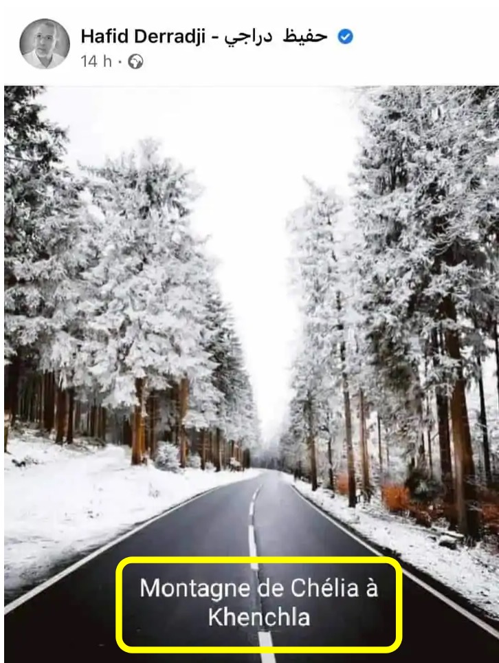 ونشر الدراجي صورا زعم أنها لمناطق في الجزائر، ليتضح أن إحداها تخص مدينة إفران المغربية، معلقا عليها بالقول: