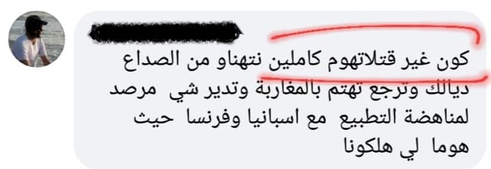 وأوضح المرصد انه “على بعد أيام فقط من اليوم العالمي للتضامن مع الشعب الفلسطيني.. ناشط “أمازيغي” (يقدم نفسه موظفا أستاذا بالتعليم وشاعر و صحفي..!!) يدخل على صفحة عزيز هناوي الكاتب العام المرصد المغربي لمناهضة التطبيع ويفتخر ويشيد بقيام الكيان الصهيوني بقتل أكثر من 3000 طفل فلسطيني منذ سنة 2000 ويتمنى لو أن الكيان الصهيوني قتل كل أطفال فلسطين!”.