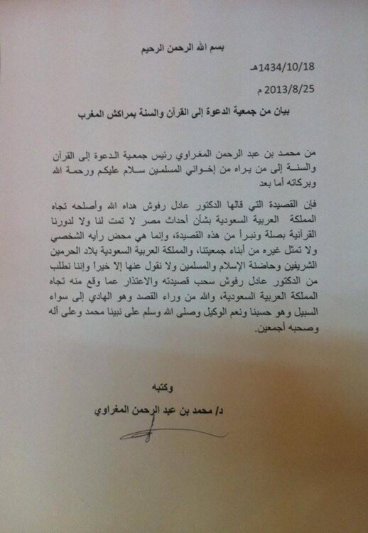 (نص بيان الشيخ محمد المغراوي في قصيدة: يا خادم الحرمين)