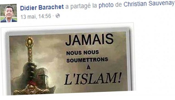 بعد تغريدة عمدة “فينيل”؛ “روبير شاردون”، التي اقترح فيها حظر الإسلام في فرنسا، نشر رئيس بلدية إقليم “إيندر”؛ “ديديه باراشيه” صورة معادية للإسلام في حسابه على فيسبوك، وفقا للمفكرة.