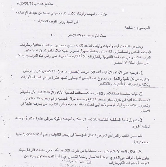 وفي إحدى الشكايات التي توصل بها موقعنا (انظر الصورة أعلاه) يتحدث أولياء التلاميذ عن العديد من الخروقات بحق أولادهم، ومنها: تحويل المدير لقاعة المطالعة إلى مكتب خاص به؛ وحجز الكتب والمراجع عن التلاميذ، ومنعهم من الاستفادة منها؛ وإغلاق قاعة الإعلاميات، وحرمان التلاميذ من ولوجها؛ بل وصل الشطط والتعسف بهذا المدير -حسب الشكاية- حد ضرب التلاميذ وشتمهم بألفاظ عنصرية، مما خلف استياء كبيرا لدى التلاميذ وأوليائهم، متسائلين: متى تقوم السلطات بردع هذا المدير وتأديبه؟