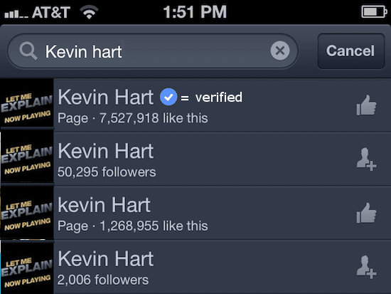 الآن يمكنك أن تشاهد أيقونة “التوثيق” verified للحسابات الموثقة،“الأيقونة الزرقاء في الصورة فوق”، وهي الميزة التي منحتها الفيس بوك لحسابات الشخصيات العامة والمشاهير ورجال السياسة والفن والرياضة، بعد التأكد من ملكيتهم للحساب بالفعل.