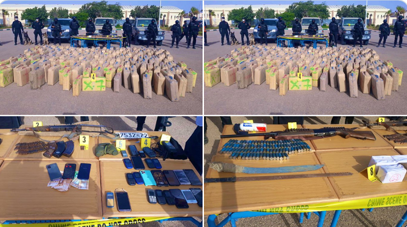 وذكر بلاغ للمديرية العامة للأمن الوطني أن إجراءات البحث والتفتيش المنجزة في هذه القضية، بمنطقة صحراوية تبعد بحوالي 30 كيلومترا عن مدينة العيون في اتجاه السمارة، أسفرت عن حجز سلاح كلاشنيكوف وثلاث خزنات تضم 66 عيارا ناريا، وبندقية صيد و114 خرطوشة، فضلا عن العثور على 216 رزمة من المخدرات يناهز وزنها الإجمالي خمسة أطنان و894 كيلوغراما من مخدر الشيرا.
