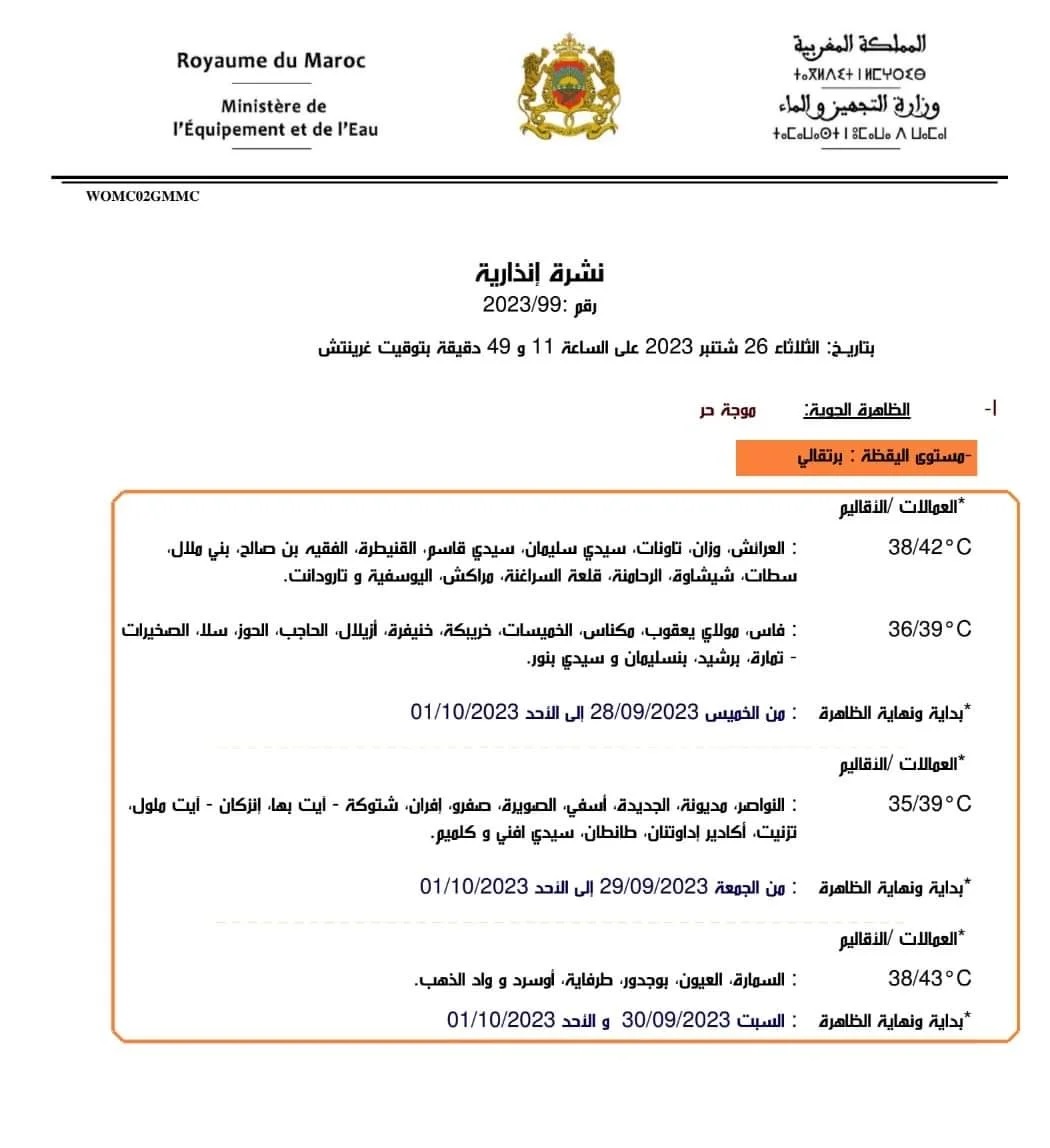 أصدرت المديرية العامة للأرصاد الجوية نشرة إنذارية، تهم مناطق واسعة من المملكة، ابتداء من الخميس 28 شتنبر الجاري.
