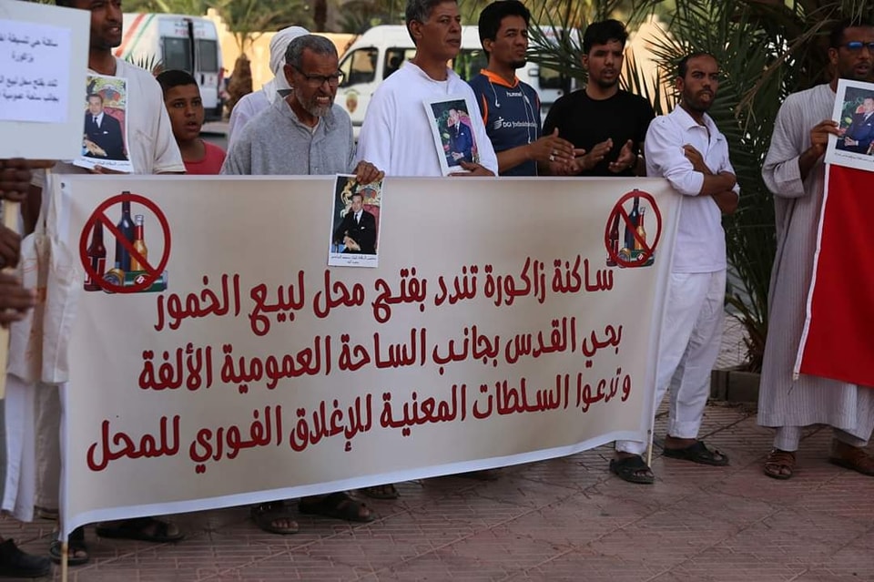 يشهد حي القدس بمدينة زاكورة، منذ شهرين، احتجاجات فعاليات مدنية رافضة لافتتاح محل لبيع الخمور في منطقة سكنية، تقع بالقرب من مؤسسات حيوية مثل المسجد والمدارس والساحة العامة ومحطة البنزين.