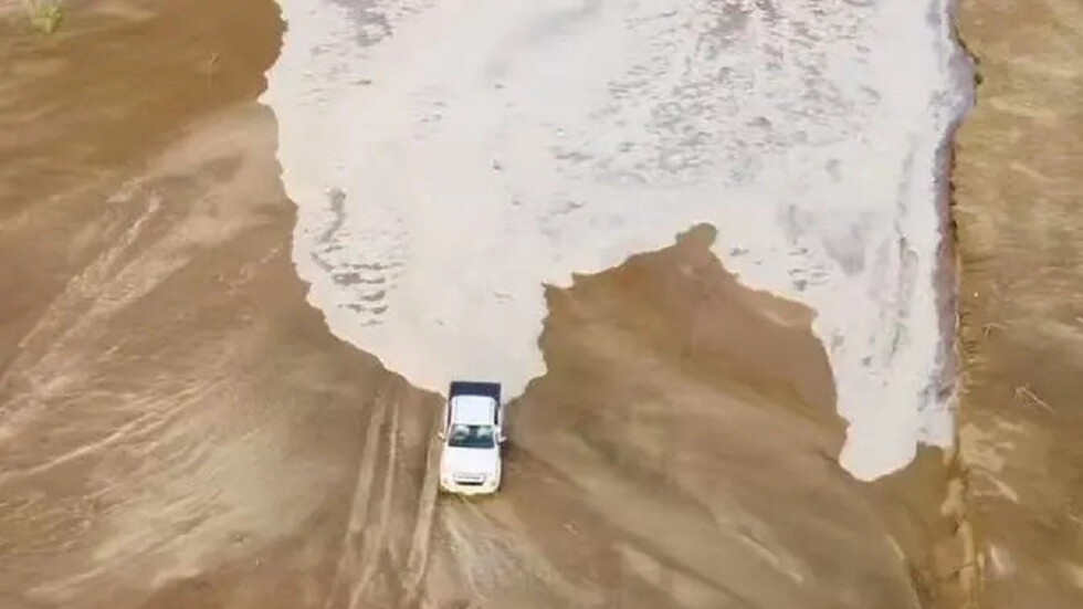 كما وثق الفيديو وجود سيارة تسير أمام السيل ويبدو أنها كانت ترافق للدرون.