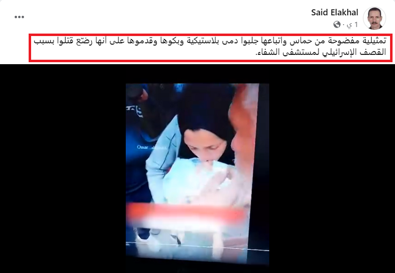 وكتب الفاعل المثير للجدل تعليقا على مقطع فيديو على صفحته بالفيسبوك، يوثق لأم تفارق بحرارة جثة رضيعها “تمثيلية مفضوحة من حماس واتباعها جلبوا دمى بلاستيكية وبكوها وقدموها على أنها رضّع قتلوا بسبب القصف الإسرائيلي لمستشفى الشفاء”.