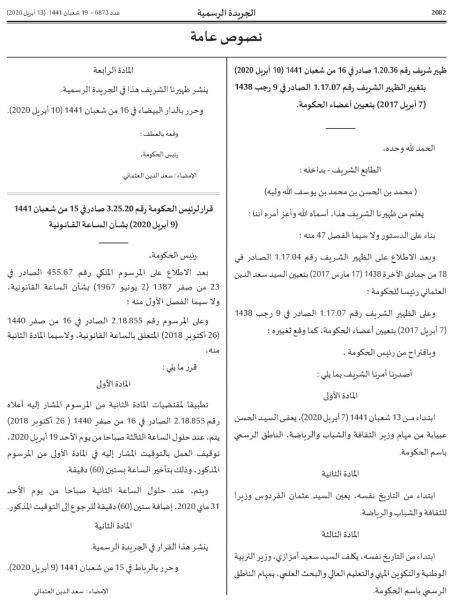 وتابع القرار أنه سيتم عند حلول الساعة الثانية صباحا من يوم الأحد 31 ماي 2020، إضافة 60 دقيقة للعودة إلى الساعة القانونية الجديدة التي أقرتها المملكة.