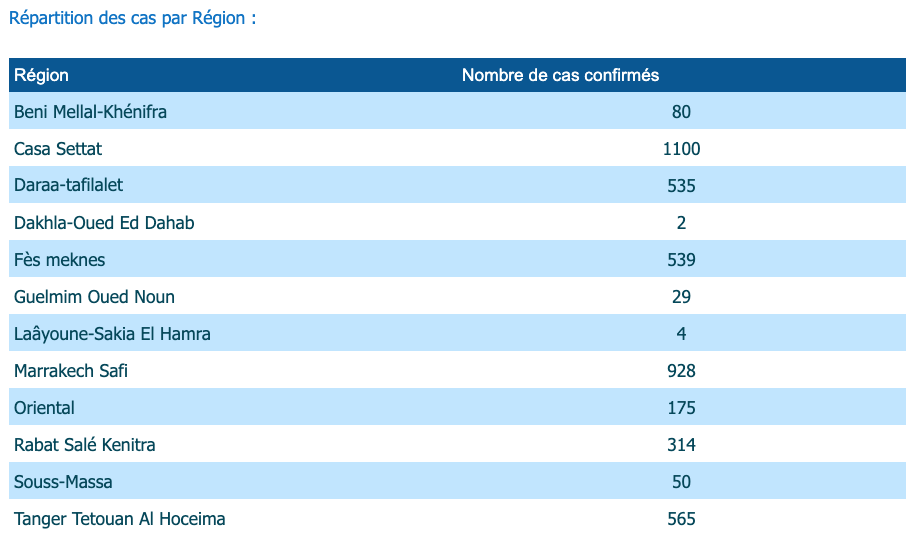 وتحتل جهة العيون الساقية الحمراء المرتبة الحادية عشر ب 4 حالات. وقد تم شفاء هاته الحالات ورجعت هذه الجهة لصفر حالة.