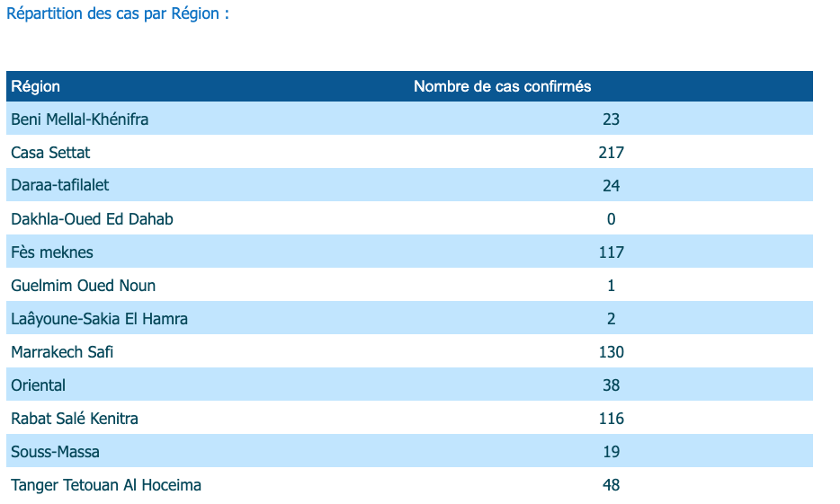 أن جهة الدار البيضاء سطات، في المرتبة الأولى بتسجيلها ل 217 حالة إصابة.