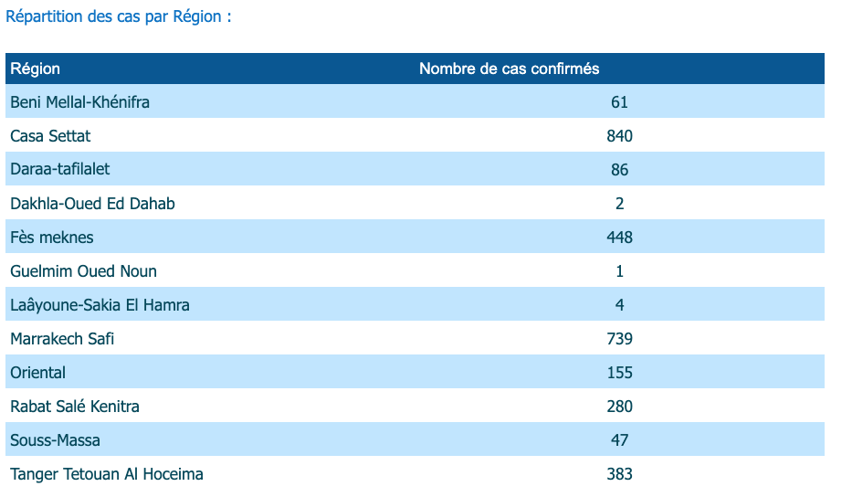 وأوضحت الوزارة حسب جدول يبين توزيع الحالات  3046 على جهات المملكة: