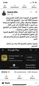 وفي هذا الصدد، قال أحد المستخدمين “التطبيق في الصورة ديال القرٱن الكريم وتم تحميله 500 ألف مرة…التطبيق فيه الٱيات مغلوطة ومحرفة..وكاين ٱيات بأكملها ممسوحة من السور + قلبوا الكلمات في نفس الٱية..”.