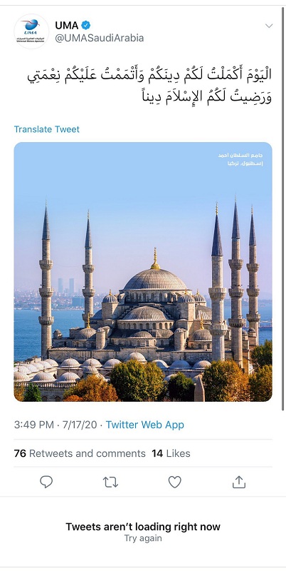 في تصرف لافت للنظر نشرت شركة سعودية اعتذارا عن نشرها آية قرآنية، غردت بها على حسابها بـ”تويتر”، مرفقة بصورة لمسجد السطان أحمد في مدينة إسطنبول التركية.