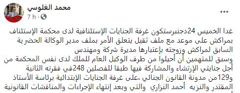 تبث غرفة الجنايات الإستئنافية لدى محكمة الإستئناف بمراكش، غدا الخميس في ملف مدير الوكالة الحضرية السابق لمراكش “خ. و” وزوجته بإعتبارها مديرة شركة ومهندس. أي أن محكمة الإستئناف بمراكش ساكون على موعد مع ملف ثقيل يهم مدير الوكالة الحضرية السابق لمراكش وزوجته بإعتبارها مديرة شركة ومهندس.