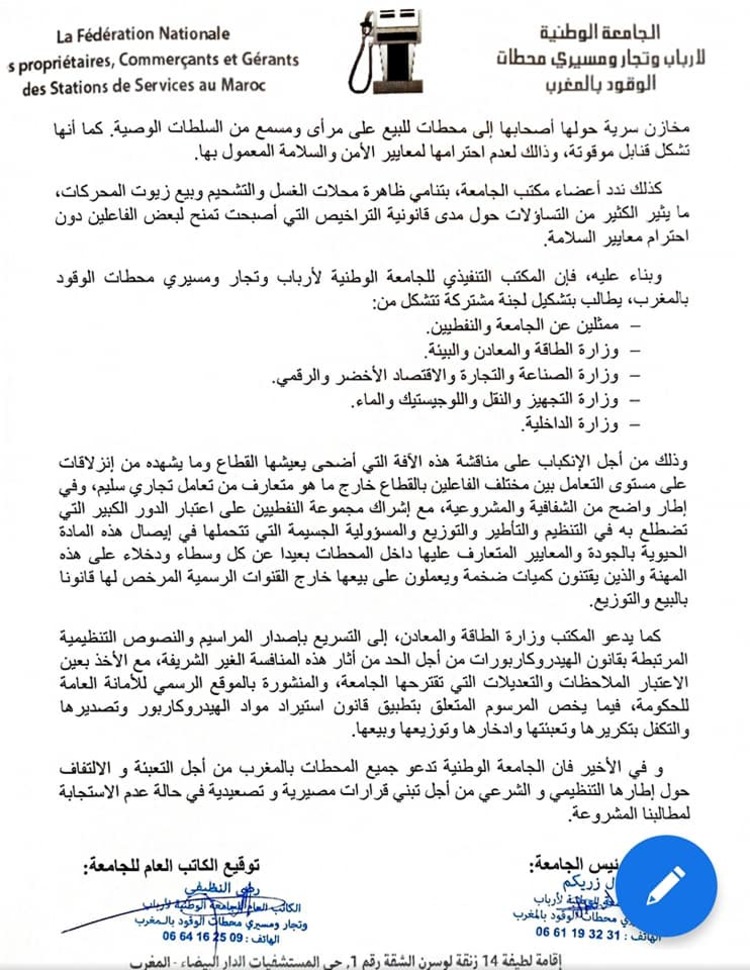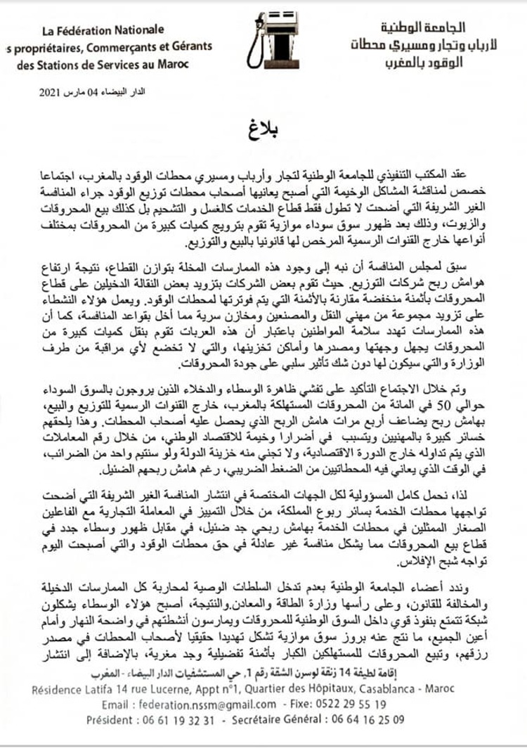 وحمل المصدر ذاته، المسؤولية للجهات المختصة في انتشار المنافسة الغير الشريفة التي أضحت تواجهها محطات الخدمة بساشر ربوع المملكة. منددا بعدم تدخل السلطات الوصية لمحاربة هذه الممارسات الدخيلة والمخالفةللقانون.