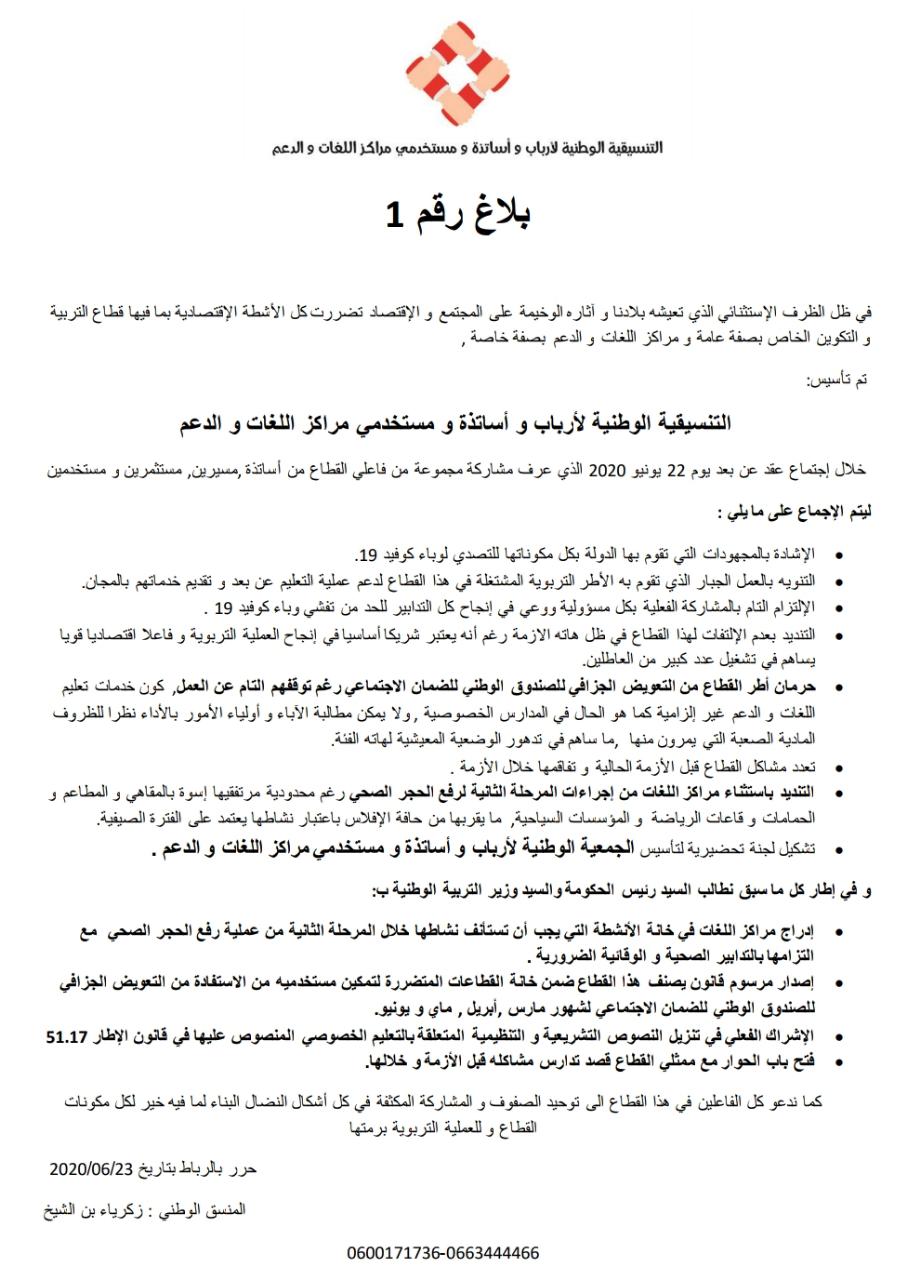و نددت التنسيقية الوطنية لأرباب و أساتذة و مستخدمي مراكز اللغات و الدعم، من ما وصفته باللامبالاة و عدم الالتفات إليهم خلال الأزمة التي تمر بها البلاد، باعتبارهم شريكا أساسيا في أنجاح العملية التربية و فاعل اقتصادي قوي ساهم في تشغيل عدد كبير من العاطلين، خاصة بعد استثناء مراكز اللغات من إجراءات المرحلة الثانية لرفع الحجر الصحي رغم محدودية مرتفقيها أسوة بالمقاهي و المطاعم والحمامات و قاعات الرياضة و المؤسسات السياحية، ما يقربها من حافة الإفلاس باعتبار نشاطها يعتمد على الفترة الصيفية