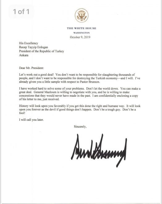 ونشر البيت الأبيض أمس الأربعاء، نص رسالة أرسلها ترامب إلى أردوغان في 9 من أكتوبر، حذّر فيها تركيا من القيام بعملية عسكرية في سوريا بأسلوب وصف بـ”المهين” وحذر فيها من عقوبات كبيرة.