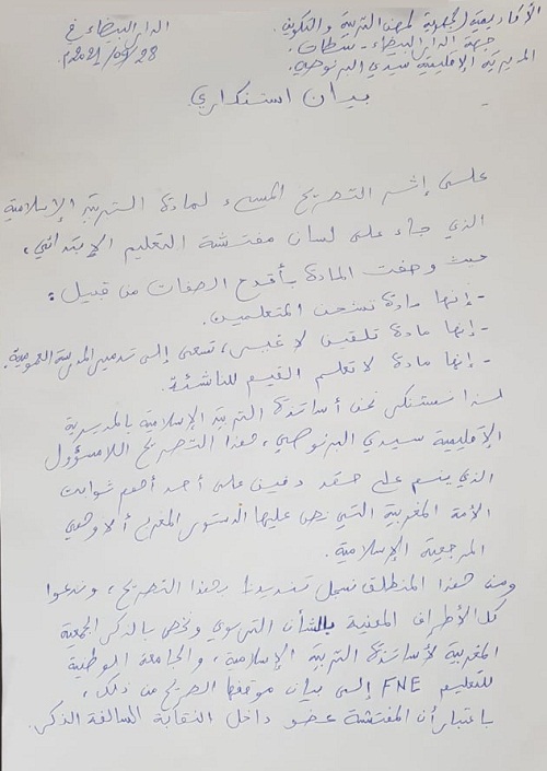 “على إثر التصريح المسيء لمادة التربية الإسلامية الذي جاء على لسان مفتشة التعليم الإبتدائي، حيث وصفت المادة بأقدح الصفات من قبيل: