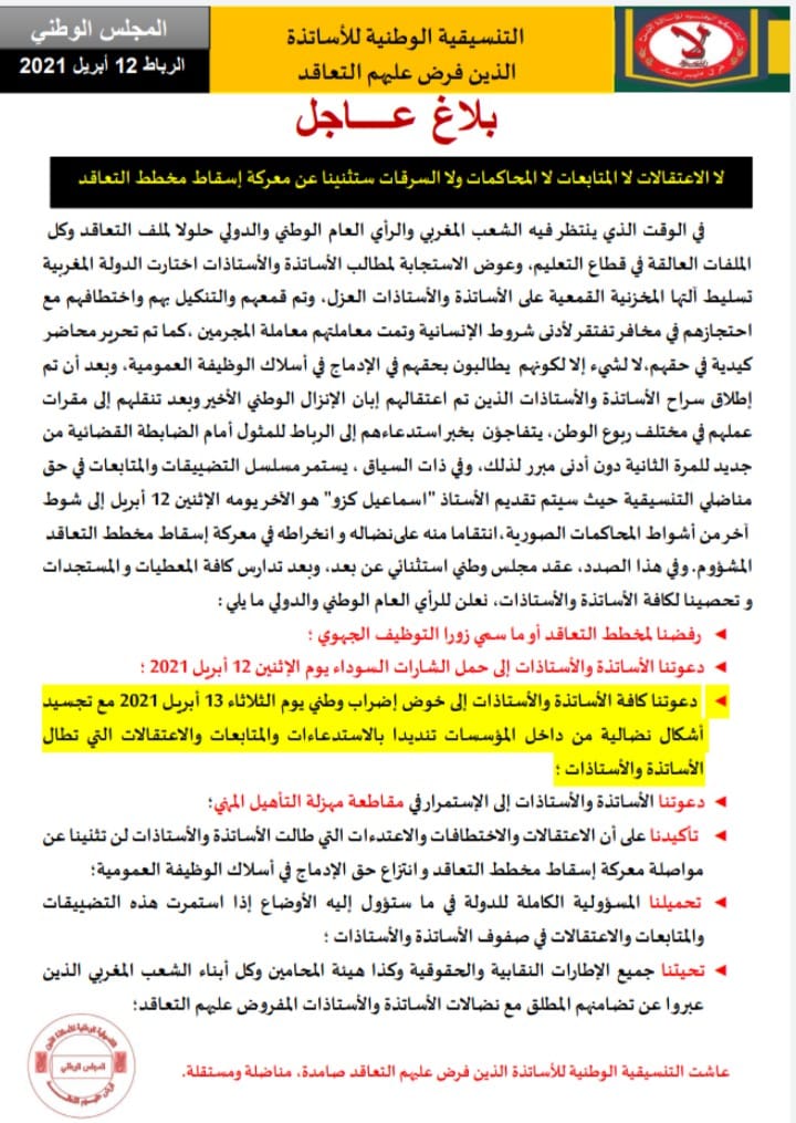 ودعت التنسيقية المذكورة الأساتذة والأستاذات إلى “خوض إضراب وطني يوم غد الثلاثاء 13 أبريل 2021، مع تجسيد أشكال نضالية من داخل المؤسسات تنديدا بالاستدعاءات والمتابعات والاعتقالات التي تطال زملاءهم”، معبرة عن “رفضها لمخطط التعاقد أو ما سمي زورا التوظيف الجهوي”، داعية “الأساتذة والأستاذات إلى حمل الشارات السوداء اليوم الإثنين 12 أبريل الجاري”، كما دعت الأساتذة والأستاذات إلى “الاستمرار في مقاطعة مهزلة التأهيل المبني”.