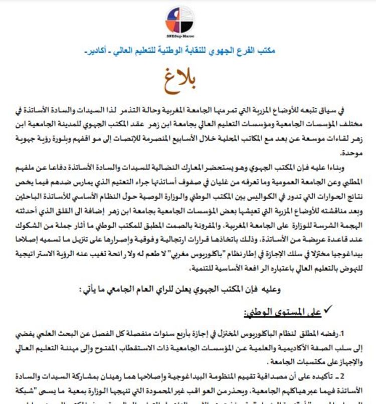 وفي الوقت الذي أعلن فيه أساتذة جامعة ابن زهر ” تشبثهم بالإصلاح الشمولي الذي قررته المؤتمرات الوطنية القاضي باعتماد نظام أساسي جديد ومحفز للأساتذة الباحثين، يتجاوز الاختلالات الكثيرة التي تعتري النظام الحالي ويقطع مع الفئوية ويتماشى مع التطورات المتلاحقة التي يعرفها التعليم العالي”.