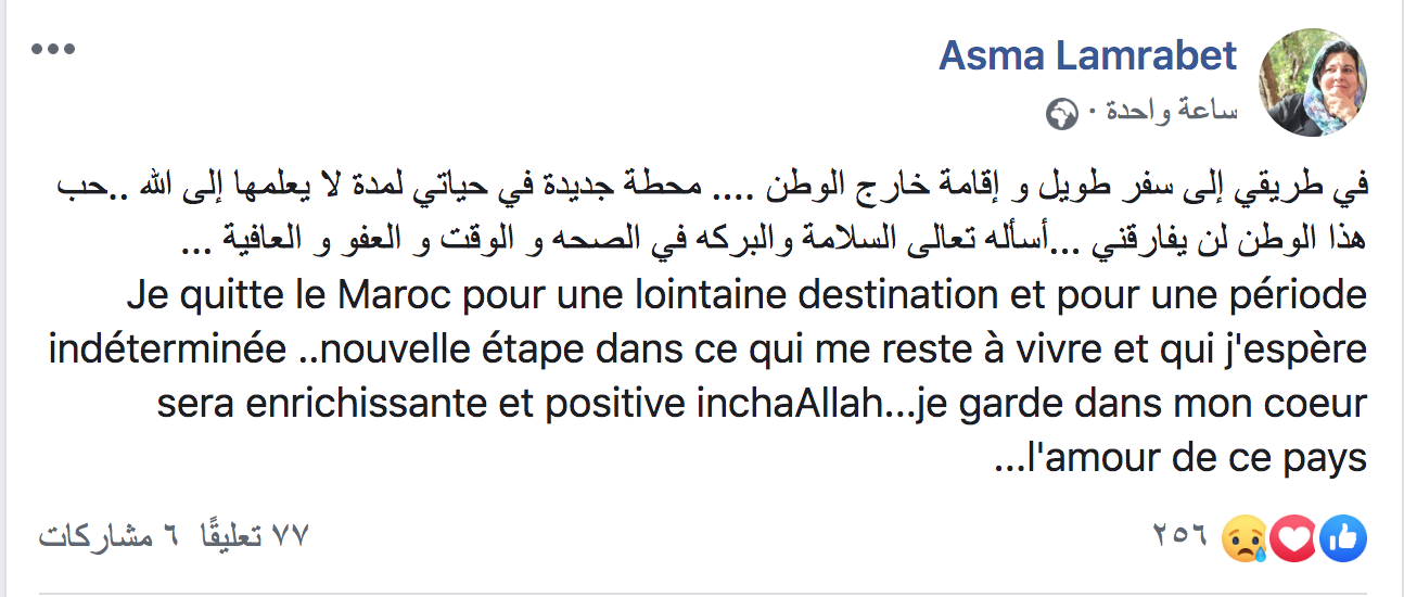 في خطوة مفاجئة أعلنت أسماء المرابط، الطبيبة المتخصصة في تشخيص أمراض سرطان الدم ورئيسة مركز الدراسات والبحوث في القضايا النسائية في الإسلام التابع للرابطة المحمدية للعلماء، الذي قدمت استقالتها منه في مارس 2018، عن مغادرتها للتراب الوطني.