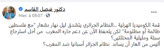 وقال فيصل في تدوينة على صفحته الرسمية على الفايسبوك: “قمة الكوميديا الهزلية …النظام الجزائري يتشدق ليل نهار بشعار “مع فلسطين ظالمة أو مظلومة” لكن يتحفظ الآن عن دعم جاره المغرب من أجل استرجاع سبتة ومليلية المحتلتين؟”.