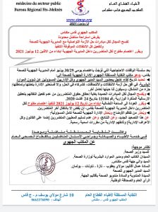 يشار إلى أن المكتب الجهوي، بعث بنظائر موجهة لكل من وزیر الصحة، والكاتب العام ومدیر الموارد البشریة لوزارة الصحة، ووالي جھة فاس مكناس، وعمال أقالیم: مولاي یعقوب – تازة – تاونات – بولمان، والمدیر الجھوي للصحة.