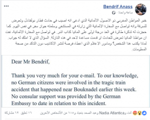 الزميل الصحافي أنس بنضريف، تعامل مع المقطع بطريقة مختلفة، بحيث تواصل مع السفارة الألمانية مستفسرا، حول ما إذا أصيب أي من مواطنيها في حادثة قطار بوقنادل، أو قدمت أي مساعدات لأي مواطن ألماني، فكانت الإجابة بالنفي.