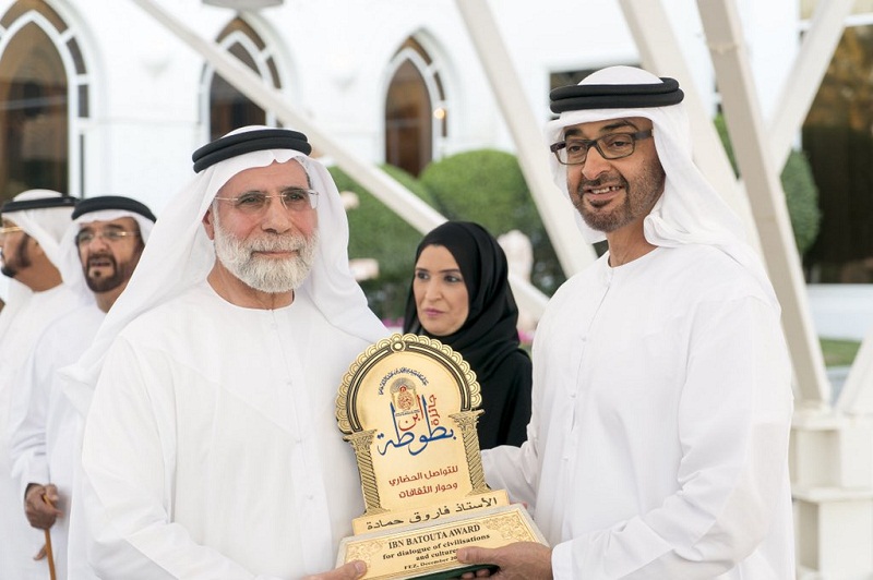 ثامنا: قال المرجفون: “وقد سمعنا غير ما مرة شهادة حق كان أستاذنا فاروق يوصينا أن نحفظها عنه: أن الشيخ محمد بن زايد لا يحتاج لمثل إهداءاته أو كتابات أحد وهو رجل الدولة العالمي من الطراز الرفيع في فكره النيِّر وحكمته وأخلاقه السمحة ورؤيته المستقبلية البعيدة وحبه لوطنه وعمله الدؤوب لرفعته، ونبل تعامله مع كل من رآه أو اقترب منه أو جالسه، وأنه استفاد منه سعة الفكر وبعد النظر وعلو الهمة، وهذه الأمور في الحقيقة هي التي تبني الدول والحضارات، وليس بالرعونة والفكر الصبياني وتتبع عورات الناس والاشتغال بهم، وقد أحل الشيخ محمد بن زايد حفظه الله شيخنا فاروق حمادة وأمثاله محل التكريم والاحترام والرعاية، أفينكر عليه الريسوني صفة الوفاء ويعدها كفراً؟؟ فلو قرأ كتب الإسلام لوجد كثيراً منها ومقدماتها تسطع بالوفاء والشكران من كاتبيها لمن كان سبباً في إنجازها ولمن هيأ لهم أسباب العلم والمعرفة”