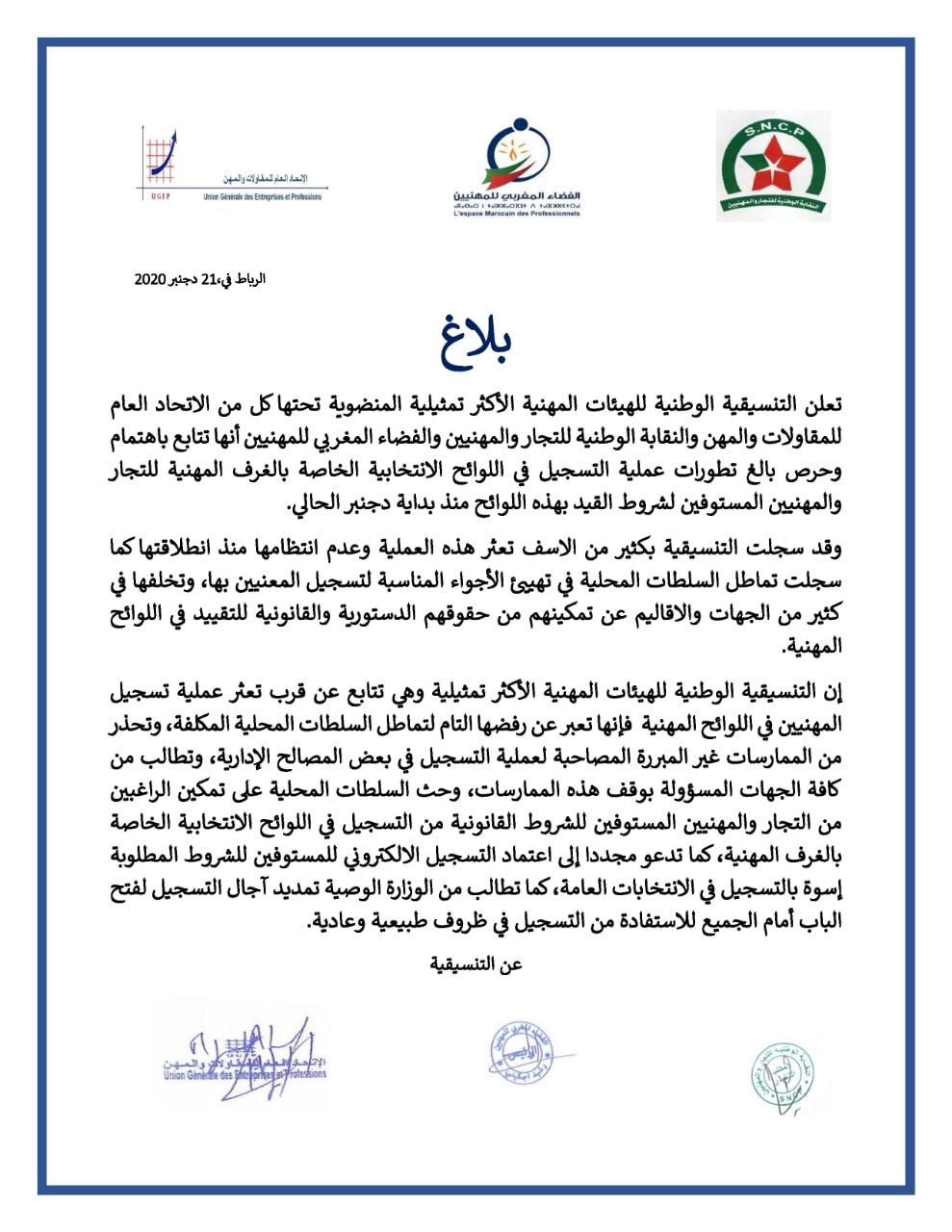 أعلنت التنسيقية الوطنية للهيئات المهنية الأكثر تمثيلية المنضوية تحتها كل من الاتحاد العام للمقاولات والمهن والنقابة الوطنية للتجار والمهنيين والفضاء المغربي للمهنيين أنها “تتابع باهتمام وحرص بالغ تطورات عملية التسجيل في اللوائح الانتخابية الخاصة بالغرف المهنية للتجار والمهنيين المستوفين لشروط القيد بهذه اللوائح منذ بداية دجنبر الحالي”.