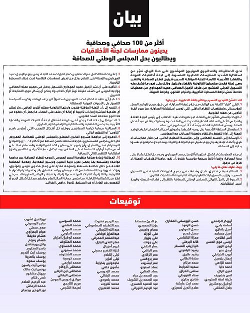 أدان أكثر من 100 صحافي وصحافية ممارسات لجنة الأخلاقيات، وطالبوا في بيان لهم بحل المجلس الوطني للصحافة، وذلك بعد الفضائح التي تضمنها الفيديو المسرب الذي نشره الصحافي حميد المهداوي.