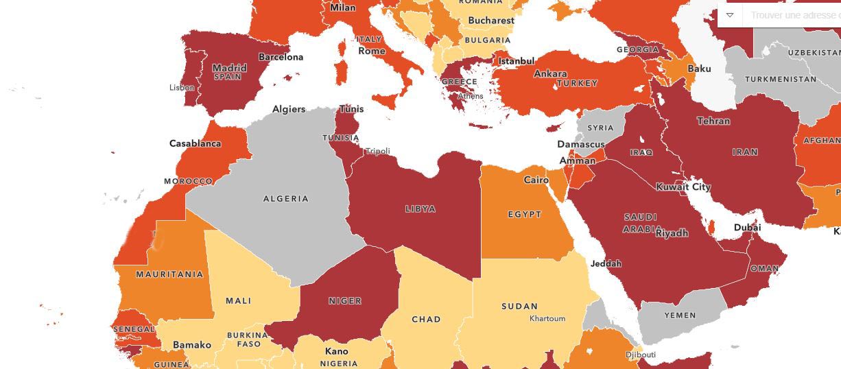 وفي المقابل، وضع المركز عددا من بلدان المنطقة ضمن الفئة الرابعة ذات الخطورة المرتفعة جدا، من بينها ليبيا وتونس، والمملكة العربية السعودية، والكويت، وإيران والعراق، والبحرين، إضافة إلى كل من إسبانيا، وجنوب إفريقيا، والبرتغال، وهولندا.