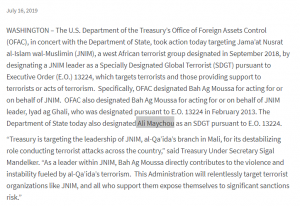 وقالت وزارة الخزانة الأمريكية، في بيان لها، إن مكتبها لمراقبة الأصول الأجنبية Office of Foreign Assets Control، أن “باه أغ موسى”، و”علي مايشو”، تمت إضافتهما لقائمة الإرهاب العالمي.