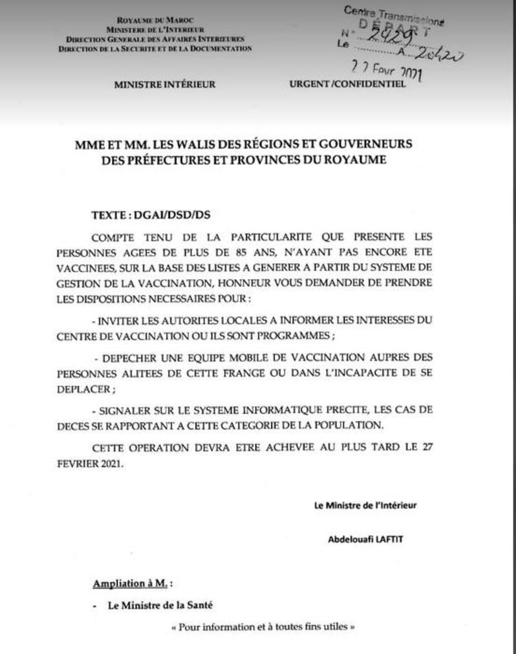 دعا وزير الداخلية عبد الوافي لفتيت الولاة والعمال بجهات وأقاليم المملكة، بضرورة التسريع في عملية تطعيم الأشخاص المسنين الذين تفوق أعمارهم 85 سنة بلقاح فيروس كورونا المستجد.