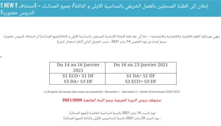 وأعلن عميد الكلية أن استئناف الدراسة حضوريا سينطلق يوم الخميس 14 يناير الجاري، في أفق موعد امتحانات الأسدس الأول من الموسم الجامعي الحالي.