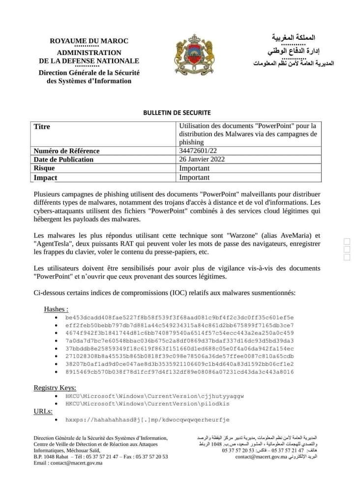 وأفادت نفس المديرية، في نشرة لها، أن المخترقين يستعملون ملفات “PowerPoint”، بهدف سرقة كلمات المرور وتسجيل نقرات لوحة المفاتيح و كذلك سرقة محتوى الحافظة.