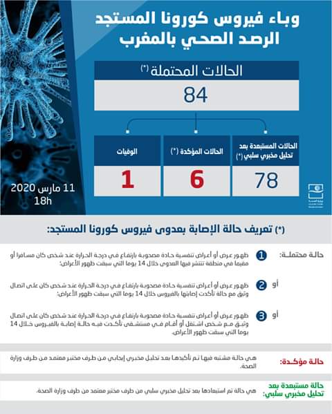 وصل عدد الحالات المحتمل إصابتها بفيروس “كورونا” المستجد في المغرب، إلى حدود مساء الأربعاء، إلى 84 حالة، 06 منها تأكد إصابتها بالفيروس وحالة وفاة واحدة.