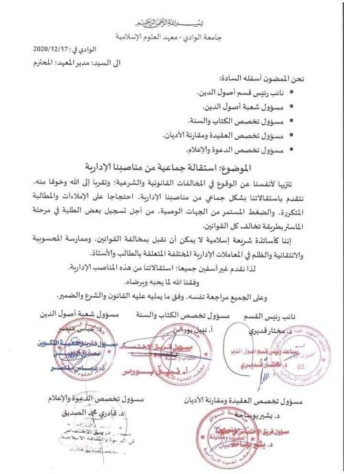 وقع اليوم الخميس خمسة مسؤولين بمعهد العلوم الاسلامية بجامعة الوادي استقالة جماعية، بسبب ما أسموه بـ”الاملاءات” الفوقية لفائدة طلبة في مرحلة الماستر.