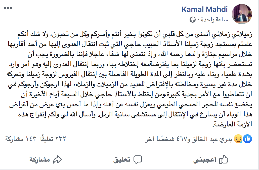وقال المهدي في نفس التدوينة: “زميلاتي زملائي أتمنى من كل قلبي أن تكونوا بخير أنتم وأسركم وكل من تحبون، …وإذ نتمنى لها شفاء عاجلا فإننا بالضرورة يجب أن نستحضر بأنها زوجة لزميلنا بما يفترضةمعه إختلاطه بها، وربما إنتقال العدوى إليه وهو أمر وارد بشدة علميا.
