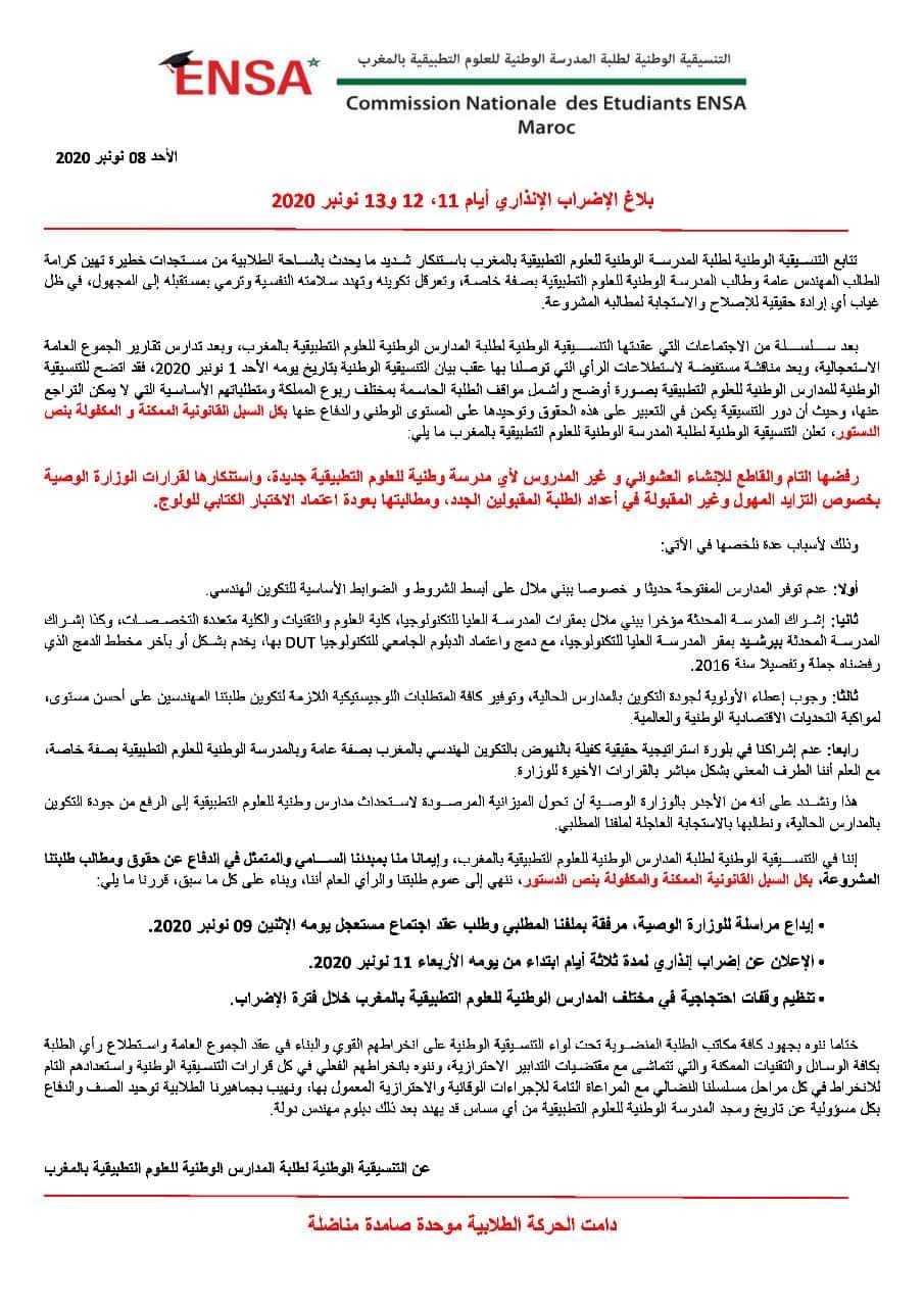 وأفاد بلاغ التنسيقية الوطنية لطلبة المدرسة الوطنية للعلوم التطبيقية بالمغرب على ضرورة وجوب إعطاء الأولوية لجودة التكوين بالمدارس الحالية، وتوفير كافة المتطلبات اللوجيستيكية اللازمة لتكوين الطلبة المهندسين على أحسن مستوى لمواكبة التحديات الاقتصادية والوطنية والدولية، يشير البلاغ إلى عدم إشراك طلبة المدرسة الوطنية للعلوم التطبيقية بالمغرب في بلورة إستراتيجية حقيقية كفيلة للنهوض بالتكوين الهندسي بالمغرب بصفة عامة وبالأخص المدرسة الوطنية للعلوم التطبيقية بالمغرب على اعتبار الطلبة طرف معني بشكل مباشر بالقرارات الأخيرة للوزارة.