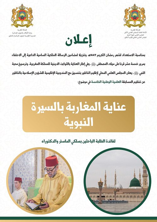 بمناسبة الاستعداد لشهر رمضان الكريم 1447ﻫ، وتنزيلا لمضامين الرسالة الملكية السامية الداعية إلى الاحتفاء بمرور خمسة عشر قرنا على ميلاد المصطفى ﷺ، وفي إطار العناية بالثوابت الدينية للمملكة المغربية، وترسيخ محبة النبي ﷺ، يعلن المجلس العلمي المحلي لإقليم الناظور بتنسيق مع المندوبية الإقليمية للشؤون الإسلامية بالناظور عن تنظيم المسابقة العلمية الوطنية الخامسة في موضوع: “عناية المغاربة بالسيرة النبوية”، لفائدة الطلبة الباحثين بسلكي الماستر والدكتوراه.