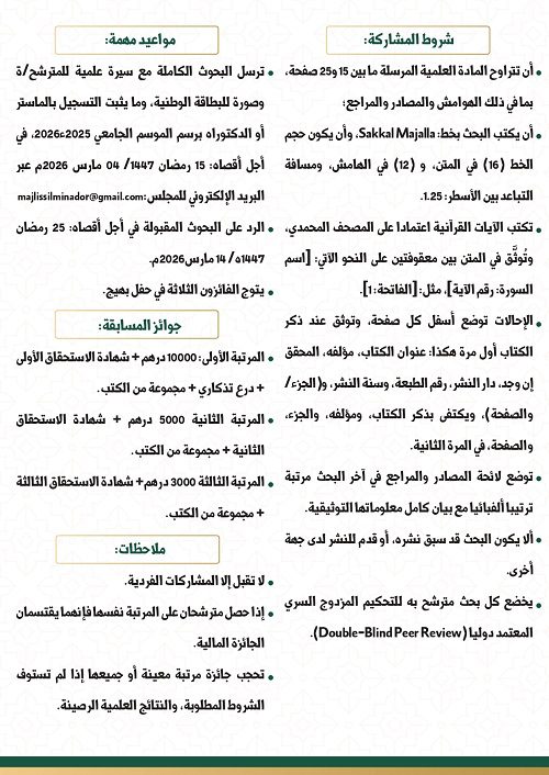 • ترسل البحوث الكاملة مع سيرة علمية للمترشح/ة وصورة للبطاقة الوطنية، وما يثبت التسجيل بالماستر أو الدكتوراه برسم الموسم الجامعي 2025-2026، في أجل أقصاه: 15 رمضان 1447/ 04 مارس 2026م عبر البريد الإلكتروني للمجلس: majlissilminador@gmail.com