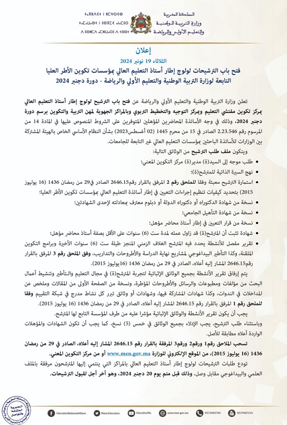 فتح باب الترشيحات لولوج إطار أستاذ التعليم العالي بمؤسسات تكوين الأطر العليا التابعة لوزارة التربية الوطنية والتعليم الأولي والرياضة – دورة دجنبر 2024.