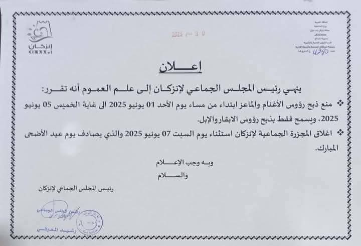 أصدر رئيس المجلس الجماعي لإنزركان، يوم 30 ماي 2025، إعلانا رسميا يعلم فيه ساكنة الجماعة بقرارات تنظيمية تتعلق بمناسبة عيد الأضحى المبارك، وتهدف إلى ضبط عمليات الذبح وحماية الصحة العامة.