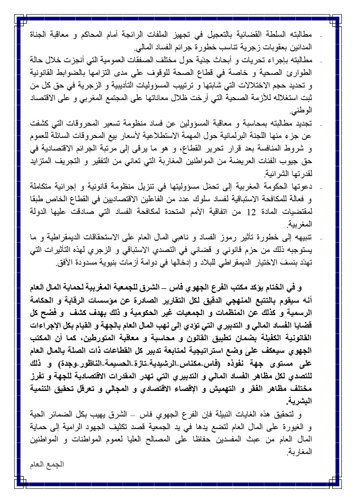 وأرجعت الجمعية، نقاش إقرار قانون الإثراء غير المشروع للواجهة، إذ أدان الفرع الجهوي للجمعية المغربية لحماية المال العام، “العرقلة التي يعرفها إقرار القانون المعاقب على الإثراء غير المشروع، والذي بقي يراوح مكانه”.