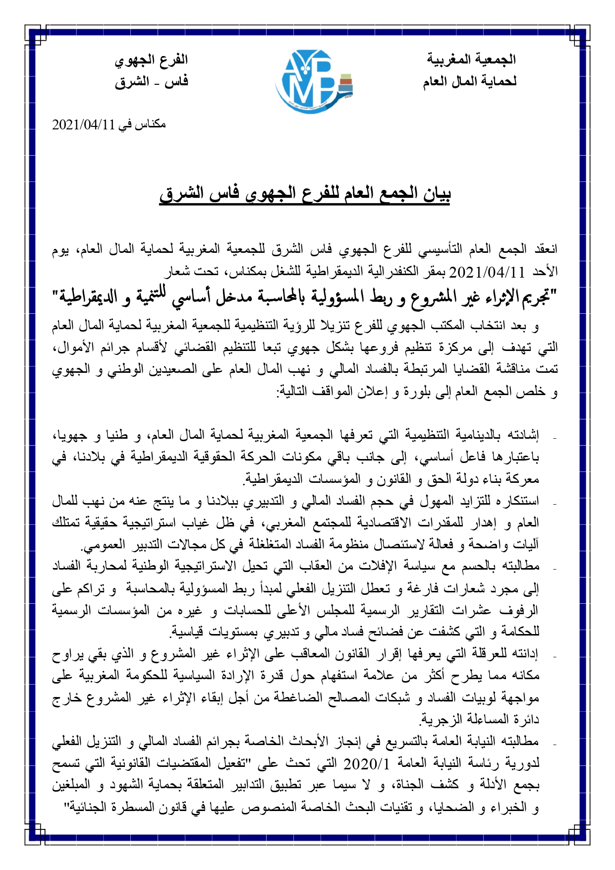 جاء ذلك، عقب الجمع العام التأسيسي للفرع الجهوي للجمعية بجهتي فاس والشرق، عقد نهاية الأسبوع بمقر الكونفدرالية الديمقراطية للشغل بمكناس، تحت شعار “تجريم الإثراء غير المشروع وربط المسؤولية بالمحاسبة مدخل أساسي للتنمية و الديمقراطية”.