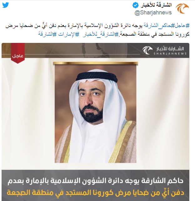 وفي هذا الإطار وجه سلطان بن محمد القاسمي أميرة الشارقة، دائرة الشؤون الإسلامية، بمنع دفن أي ضحية من ضحايا وباء كورونا.