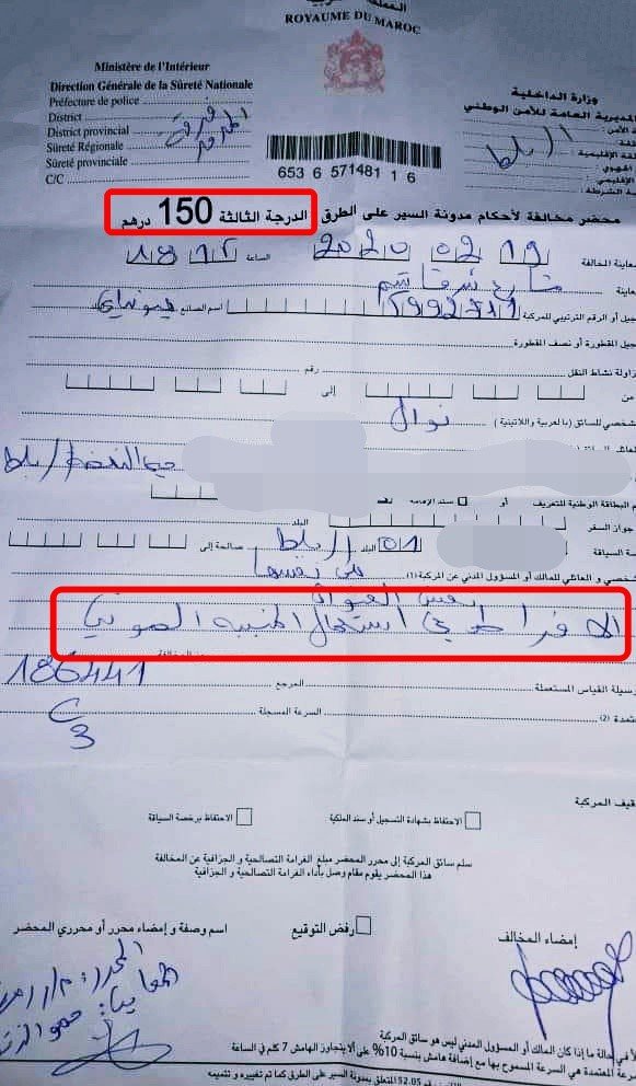 تداول رواد مواقع التواصل الاجتماعي صورة لمخالفة بقيمة 150 درهما، وهي مخالفة “الافراط في استعمال المنبه الصوتي”، وبذلك تكون عملية مراقبة وزجر المخالفات الواردة في قانون السير الجديد قد ذخلت حيز التنفيذ.