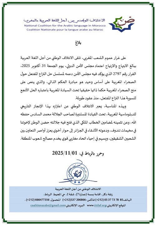 “على غرار عموم الشعب المغربي، تلقى الائتلاف الوطني من أجل اللغة العربية ببالغ الابتهاج والارتياح اعتماد مجلس الأمن الدولي، يوم الجمعة 31 أكتوبر 2025، القرار رقم 2797 الذي يؤكد فيه مجلس الأمن دعمه لمسلسل حل النزاع المفتعل حول الصحراء المغربية على أساس وحيد هو مبادرة الحكم الذاتي، والذي ينص على منح الصحراء المغربية حكما ذاتيا حقيقيا تحت السيادة المغربية باعتباره الحل الأنجع لتسوية هذا النزاع المفتعل، منذ عقود طويلة.