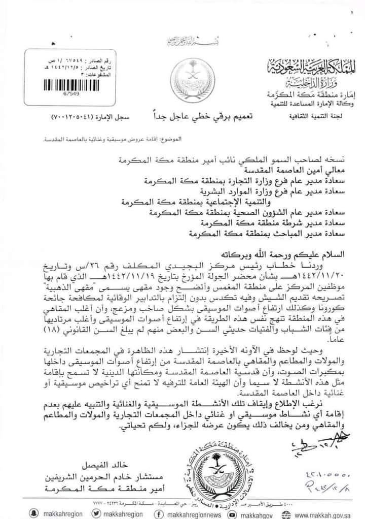 هذه مراسلة رسمية (الوثيقة المرفقة بالمقال) تثبت أن الاختلاط المشوب بالتهتك والمجون وشرب الشيشة وارتكاب المحرمات يقع في مكة مهبط الوحي، وقلب الإسلام.